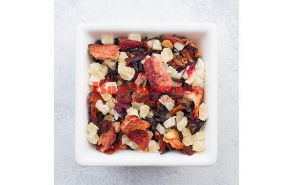 Чайный напиток на основе гибискуса с добавлением ананаса, стевии, шиповника, изюма, кусочков ежевики клубники, черного чая, листьев земляники.